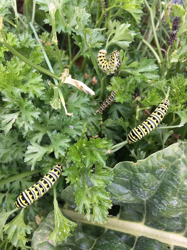 This is one of my favorite photos. These are Black Swallowtail caterpillars. They LOVE LOVE parsley and the only reason I plant it is for them. They are pretty consistent about coming and eating when I plant it next to our little koi pond. They can do a number on the plant but its parsley. I mean does parsley serve much purpose other than caterpillar food?
